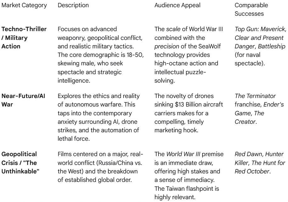 In summary, "SeaWolf: World War III" possesses the scale of a major blockbuster, the timely relevance of a modern techno-thriller, and a strong, unique selling proposition (drone attrition warfare) that should be highly appealing to major studios seeking a high-concept, franchise-ready action property.